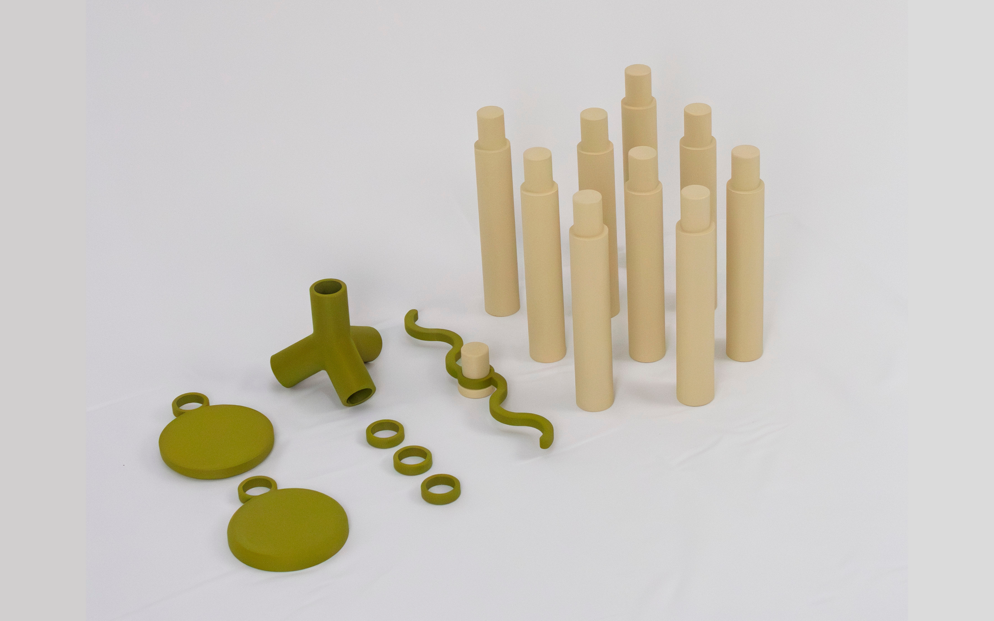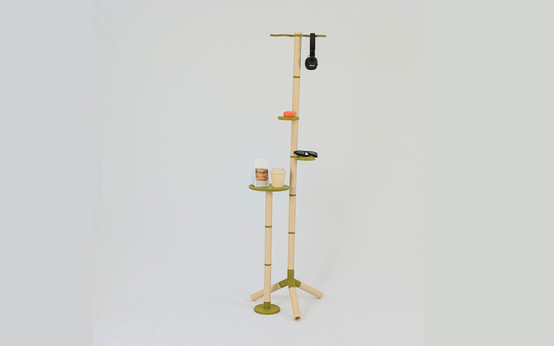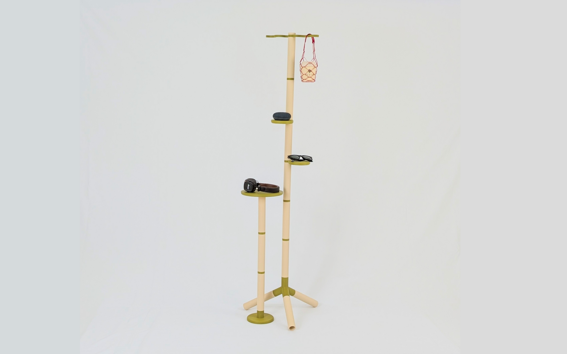 棒・関節・棚板といったパーツで構成される「BAMBO」シリーズの一作目であり、このPERCHに使用されている幹となる棒部品は、他の家具作品とも共通です。サイドテーブルや照明スタンドなど、今後のラインナップと部品を組み替えることで、家具を捨てるのではなく「別のかたちに生まれ変わらせる」ことができます。