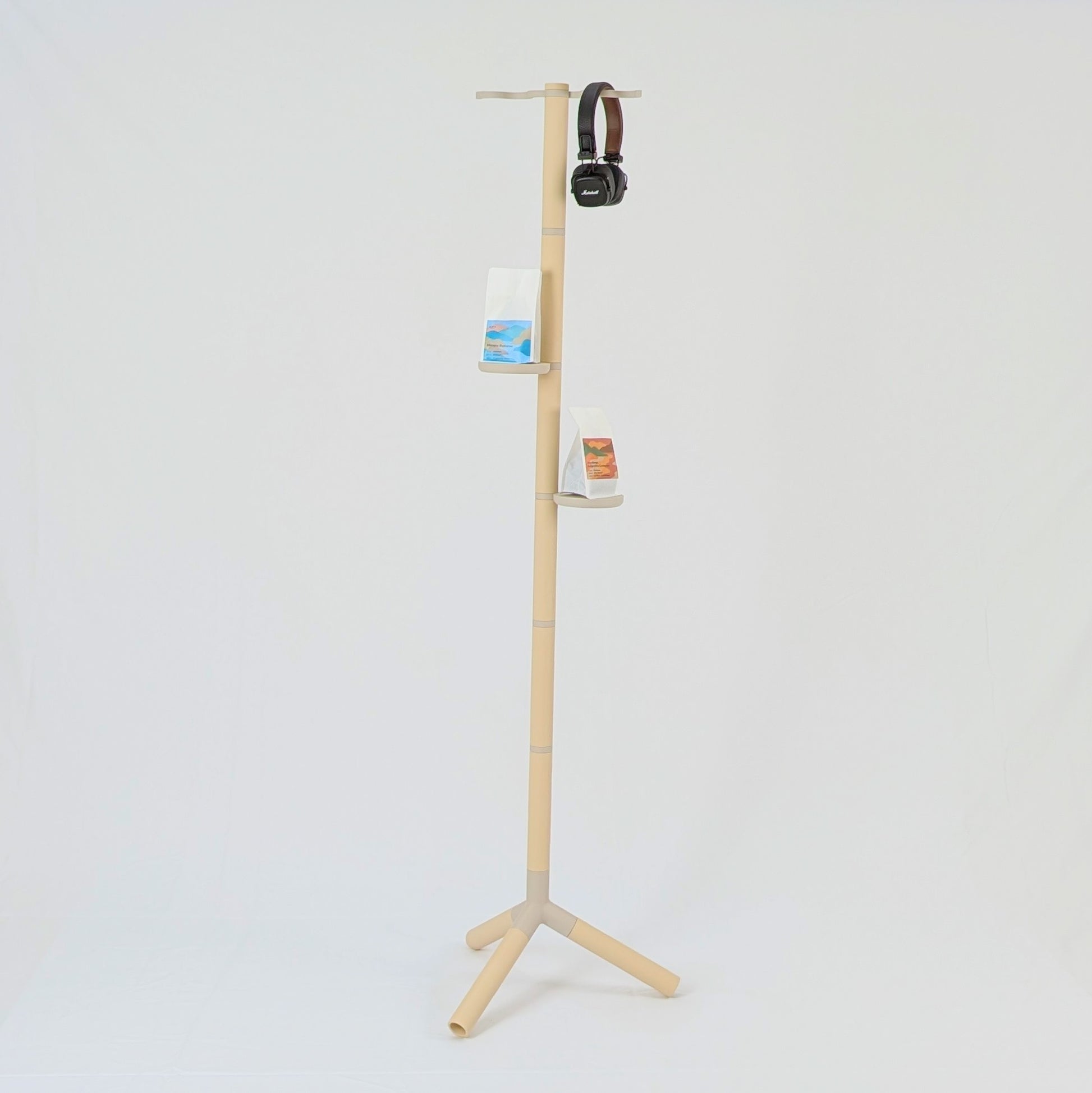 棒・関節・棚板といったパーツで構成される「BAMBO」シリーズの一作目であり、このPERCHに使用されている幹となる棒部品は、他の家具作品とも共通です。サイドテーブルや照明スタンドなど、今後のラインナップと部品を組み替えることで、家具を捨てるのではなく「別のかたちに生まれ変わらせる」ことができます。